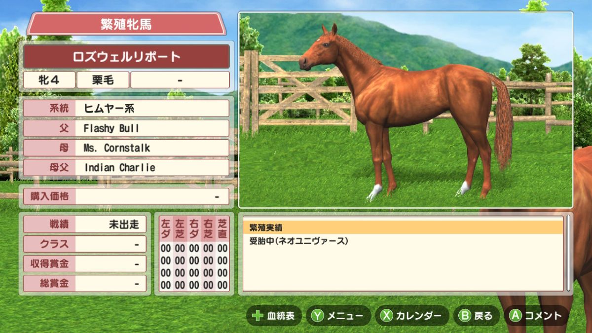 ロズウェルリポートは父Flashy Bull、母Ms.Cornstalkで、モデル馬はミリアグラシア。